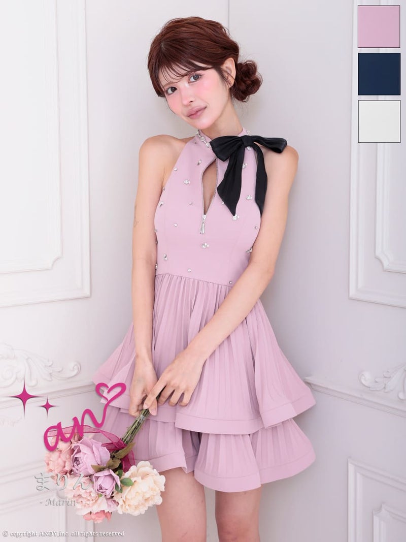 ティアードスカートが可愛らしく広がる♪ [an/アン] 高級 ホルターネック バストジップ リボン ビジュー ティアード フレアミニドレス