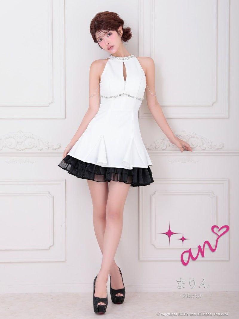 キャバドレス an アン 高級 Aライン ミニドレス 谷間 ホルターネック ジップ チュール 裾フリル ビジュー チェーン バストカット