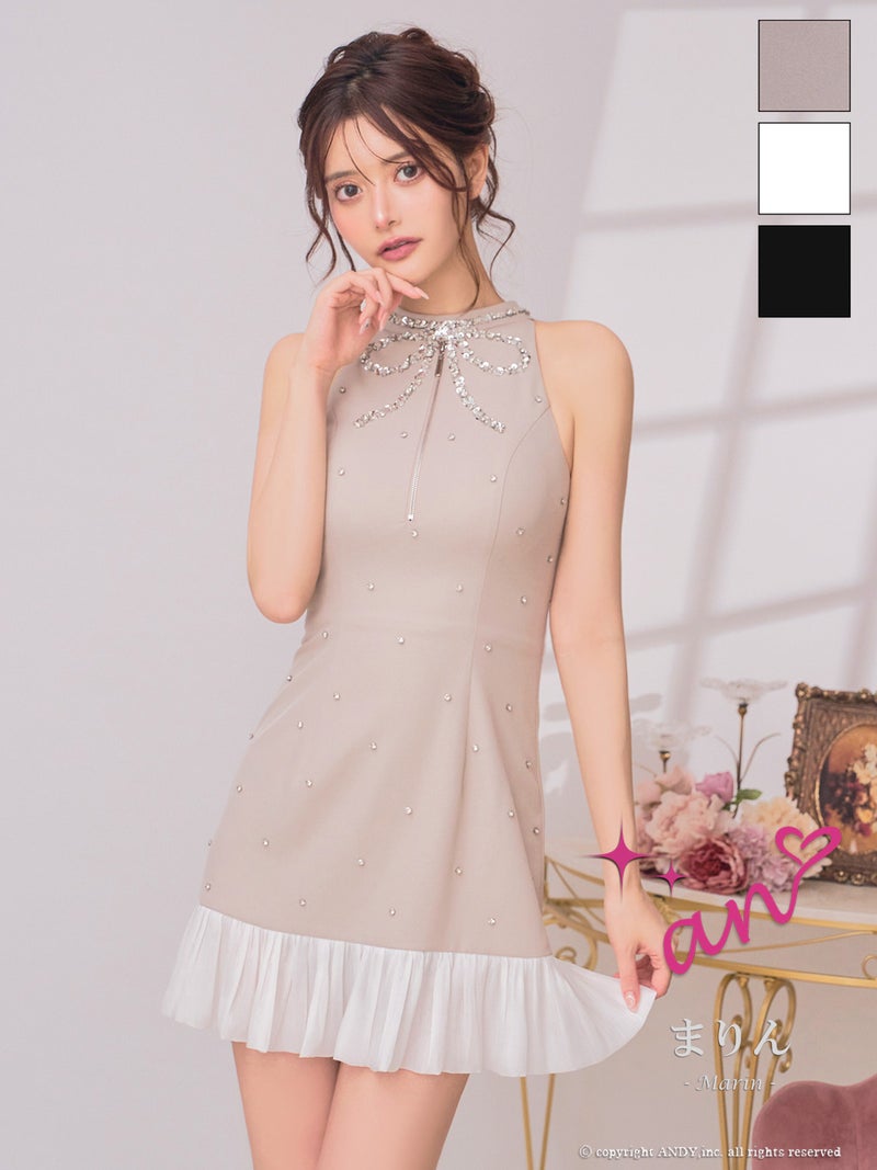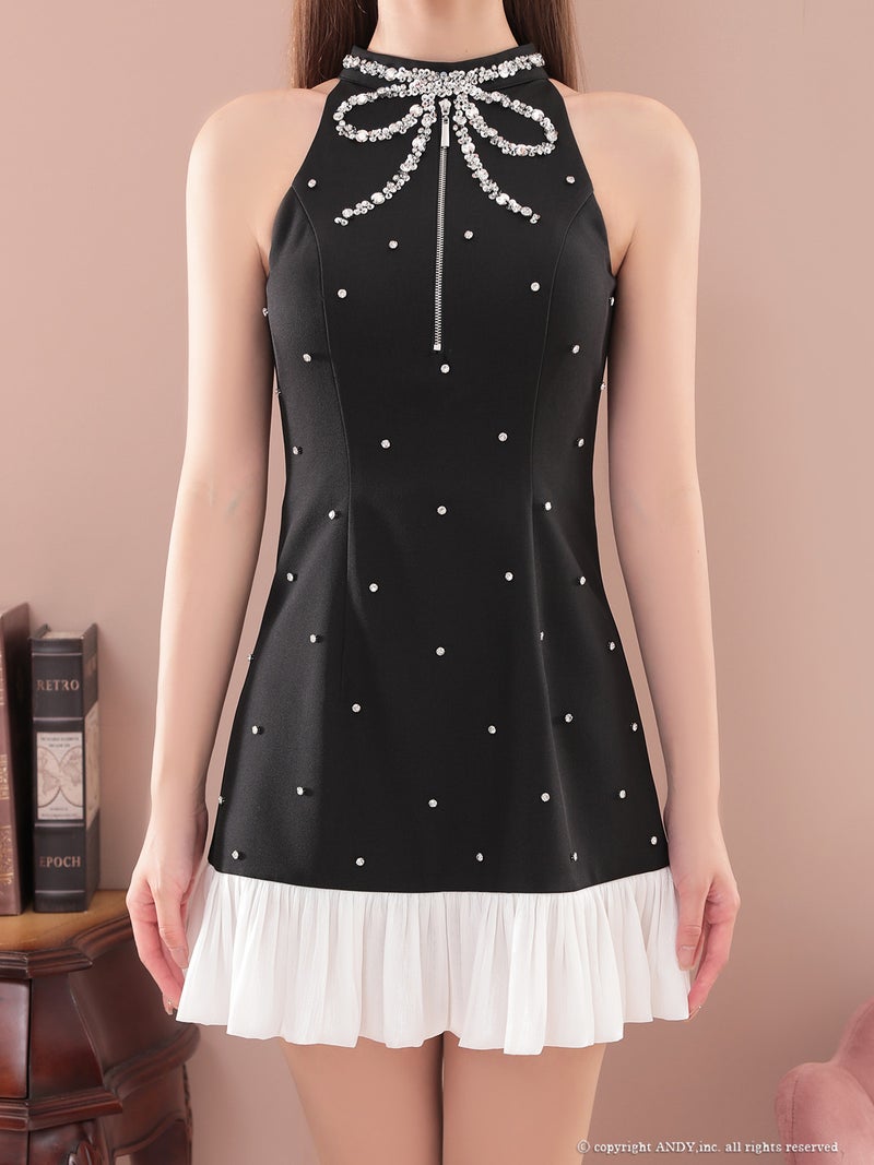 4. [an/アン] 高級 ブランド Aラインミニドレス ホルターネック バストジップ リボンデザイン ビジュー