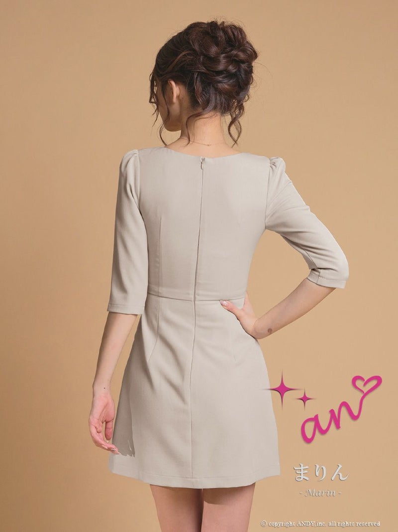 キャバドレス an アン 高級 ブランド ワンピース Aラインミニドレス シンプル 袖あり 五部袖 ウエストベルト ジップ ブラジャーのまま スクエアネック プリーツ