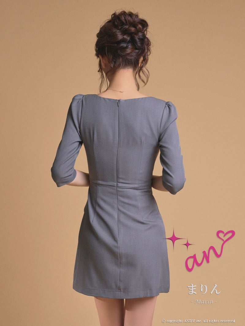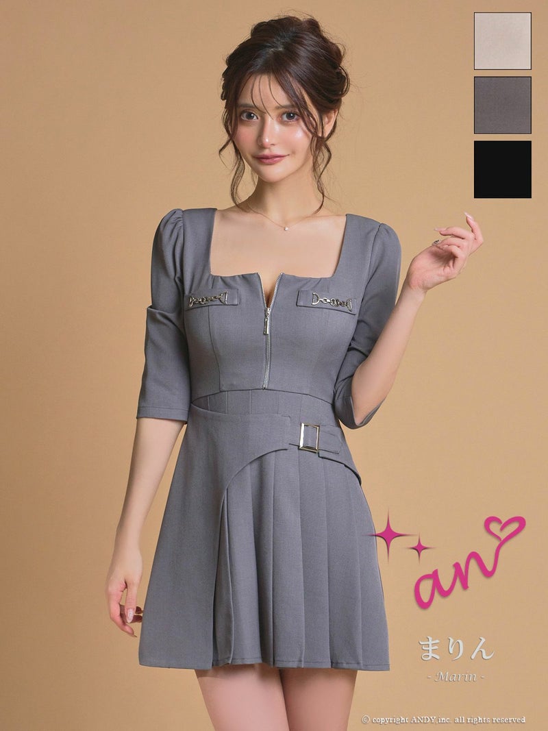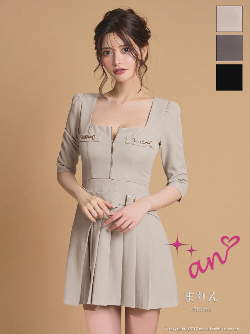 キャバドレス an アン 高級 ブランド ワンピース Aラインミニドレス シンプル 袖あり 五部袖 ウエストベルト ジップ ブラジャーのまま スクエアネック プリーツ