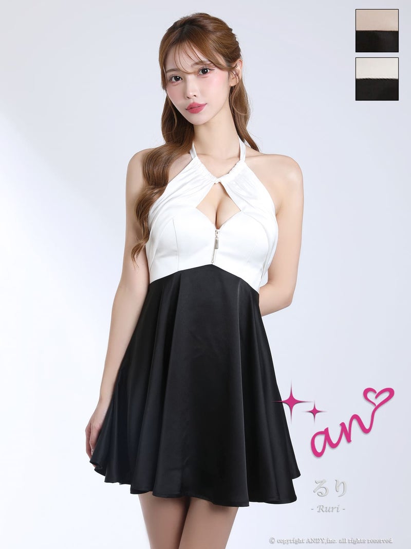 4. [an/アン] 高級 ホルターネック フレアミニドレス バストカット ジップ バイカラー