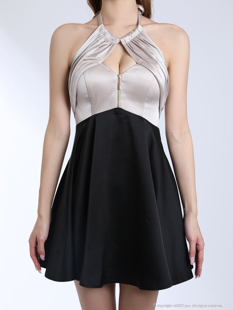 5. [an/アン] 高級 ホルターネック フレアミニドレス バストカット ジップ バイカラー