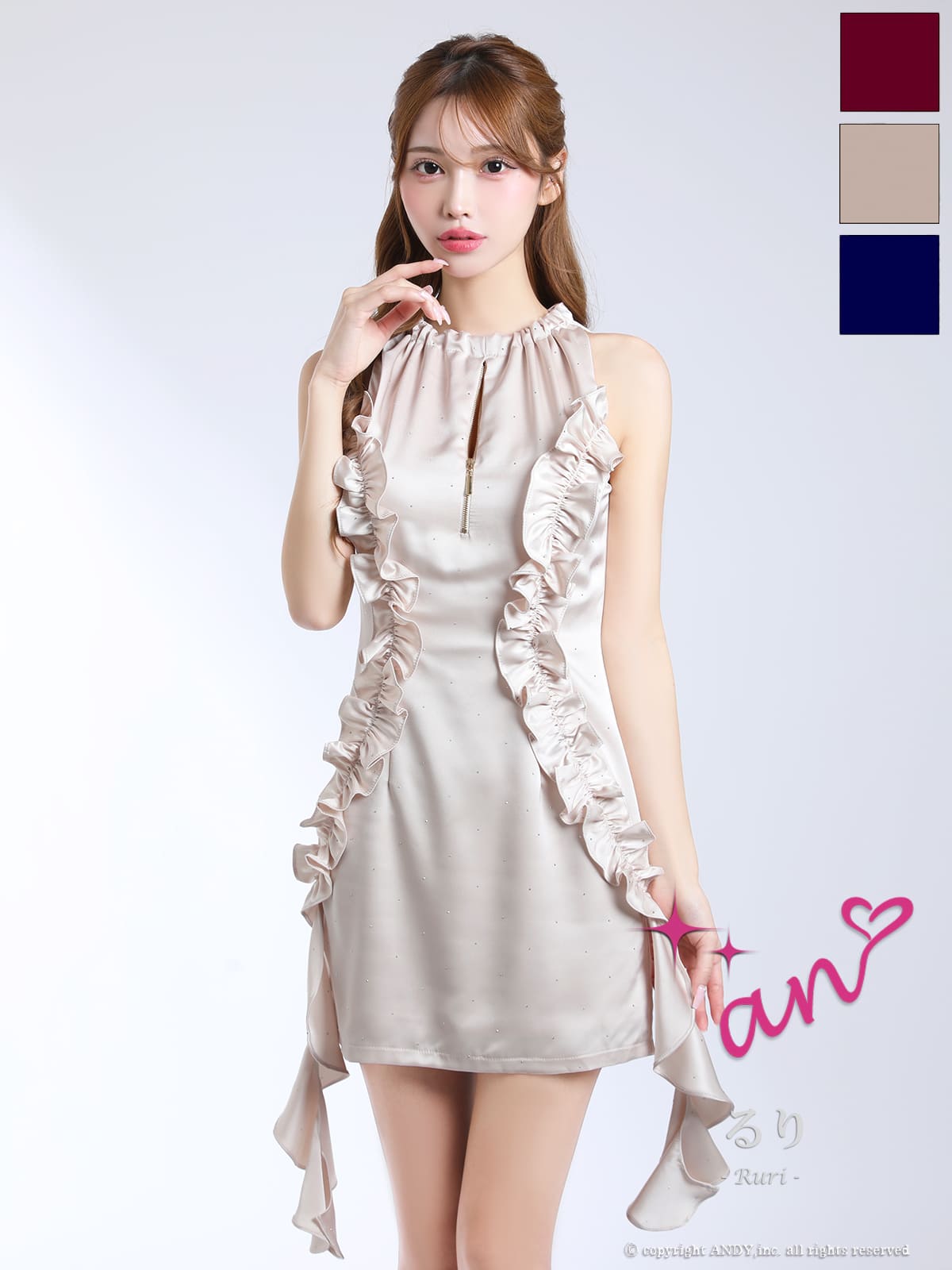 他の画像を見る フリルデザインがcute♡ [an/アン] 高級 ブランド Aラインミニドレス フリル セットアップ ノースリーブ ウエストリボン ジップ ビジュードット ¥ 29,700 税込 お気に入りに追加