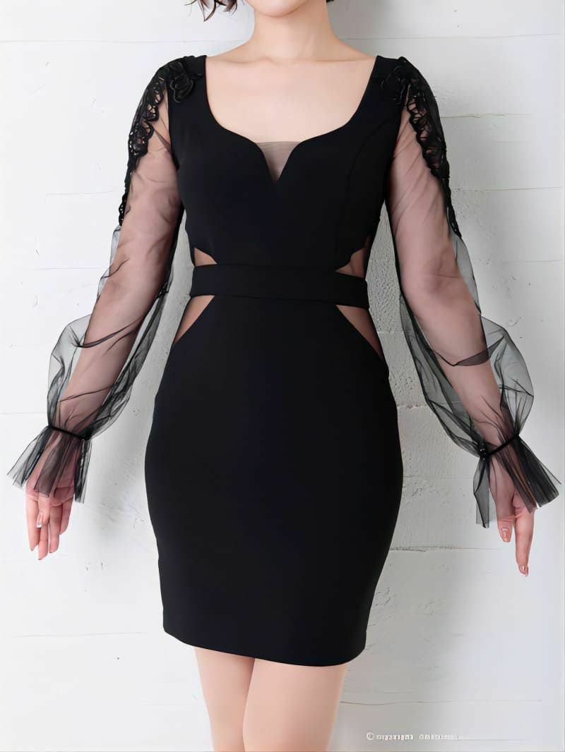 チュールスリーブがフェミニン☆ SALE [Andy/アンディ] 高級ワンカラーチュールスリーブウエストシアー長袖 袖ありくびれタイトミニドレス