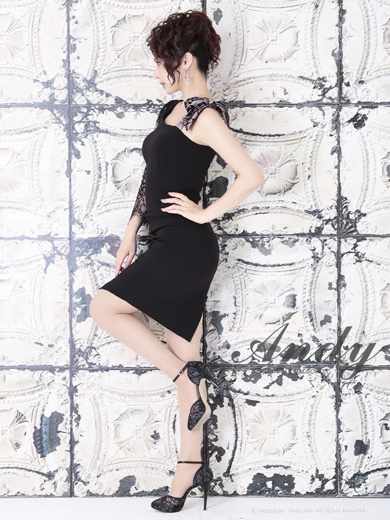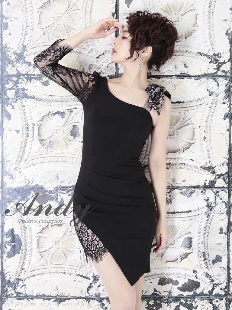 キャバドレス Andy アンディ 高級ワンショルダーリボン花柄レース袖ありワンカラータイトミニドレス