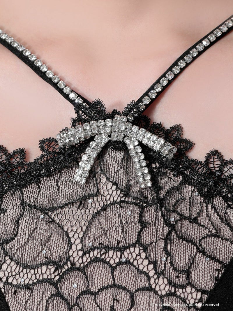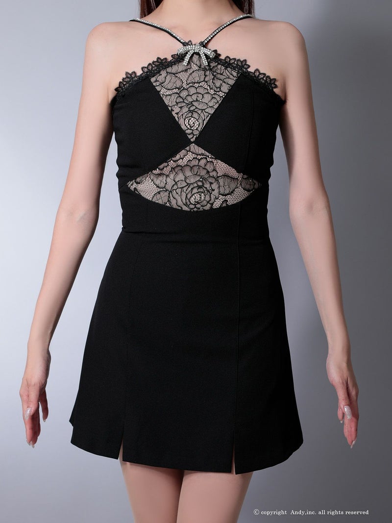 上品に魅せるセクシーなドレス♡ [Andy/アンディ] 高級 ブランド Aライン ミニドレス レース ホルターネック ビジュー リボン フラワーデザイン