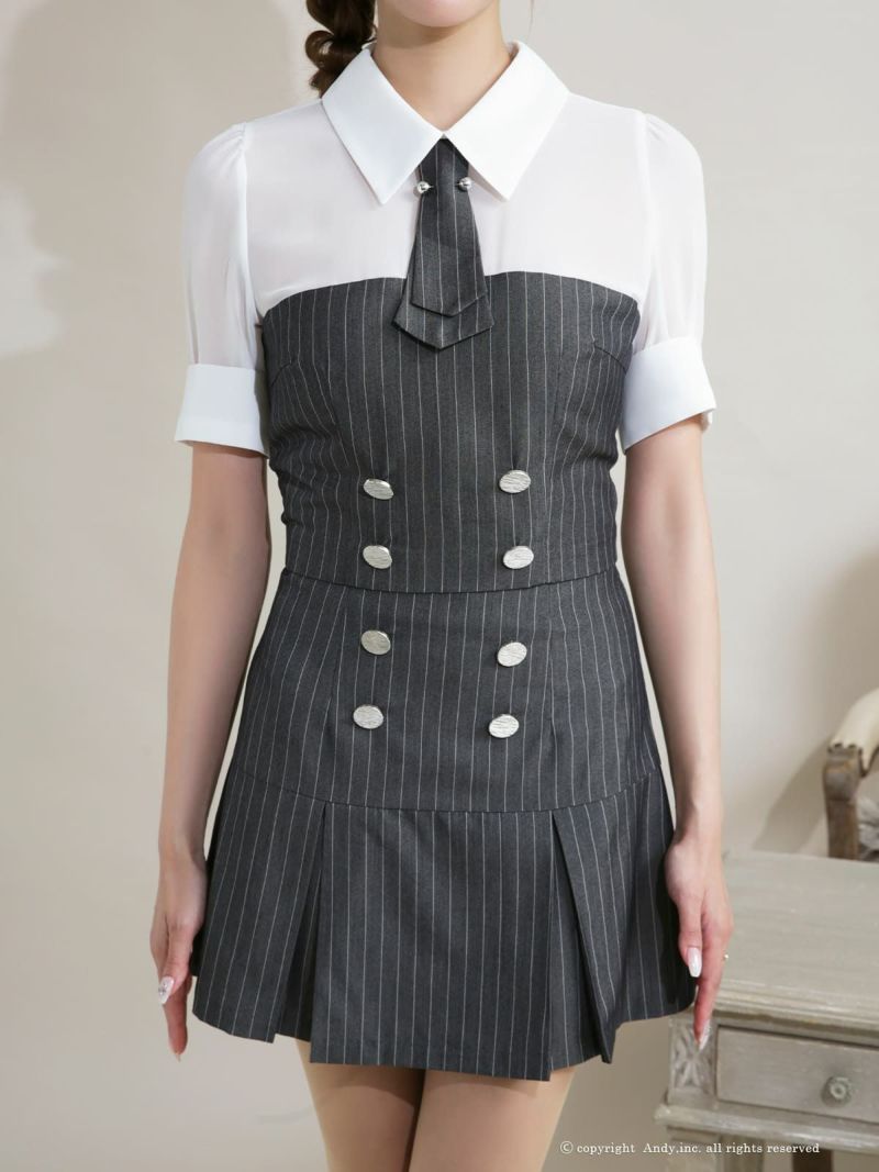 同伴にも使えるセットアップ♡ [Andy/アンディ] 高級 ワンピース Aラインミニドレス セットアップ 半袖 襟付き ストライプ