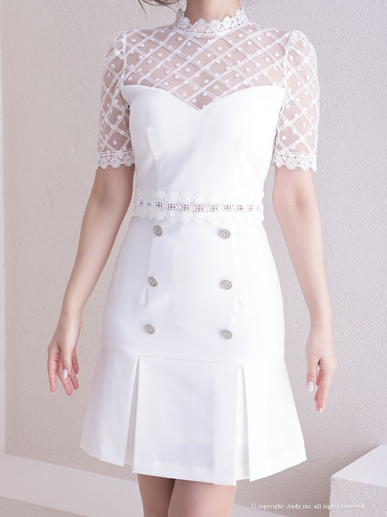 ダブルボタンとドットレースで上品さを演出☆ [Andy/アンディ] 高級ドットチェック柄シースルーワンカラー半袖フレアミニドレス