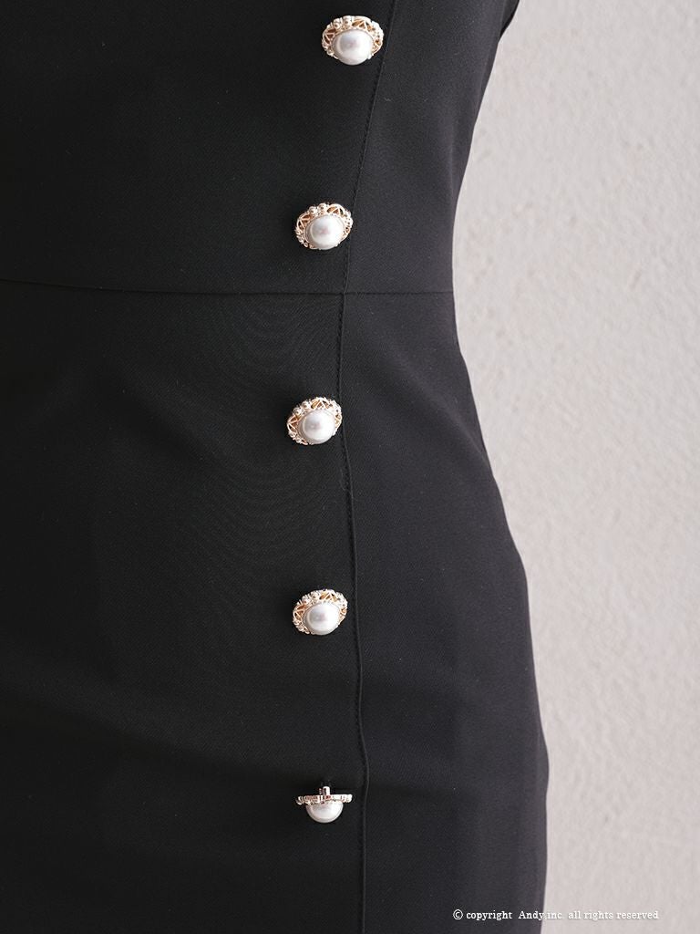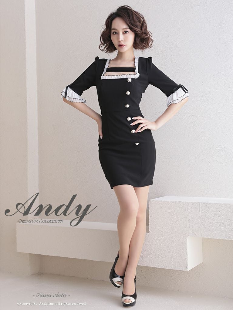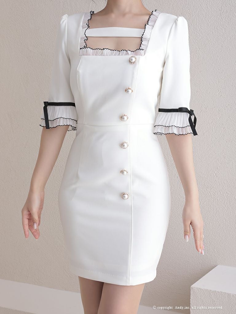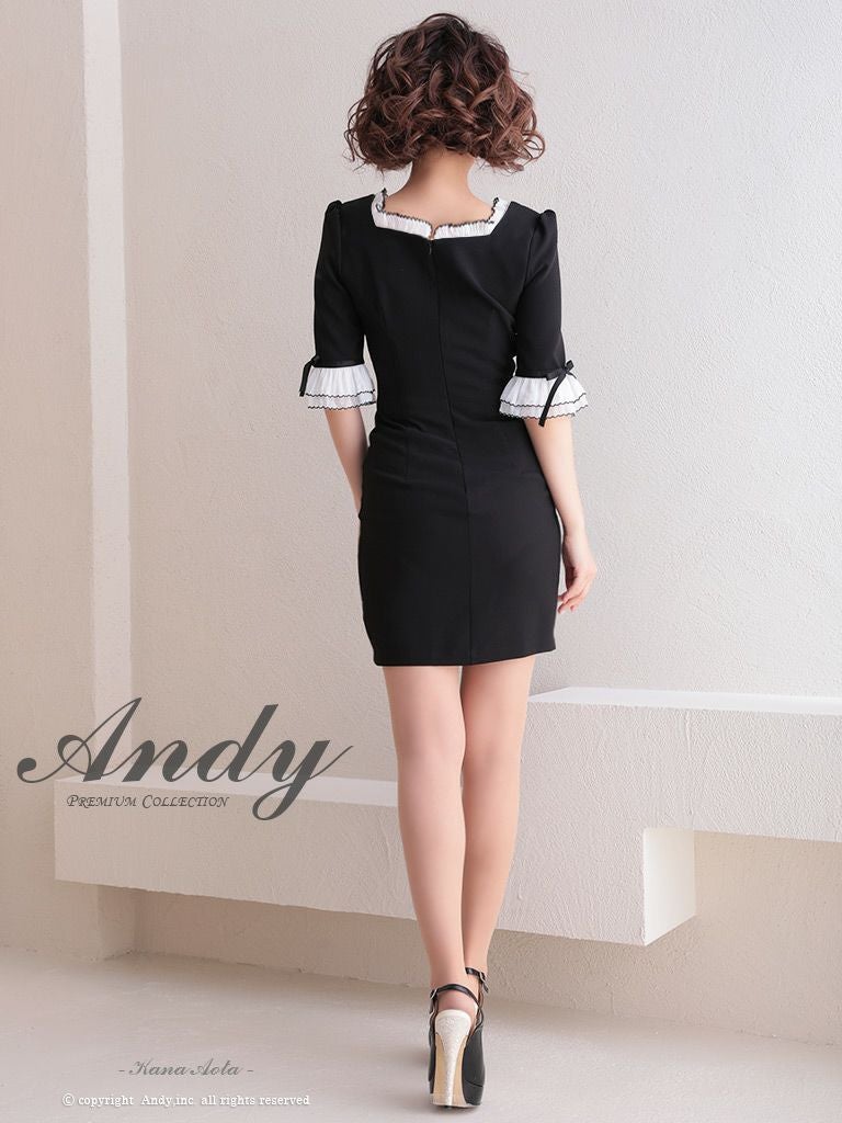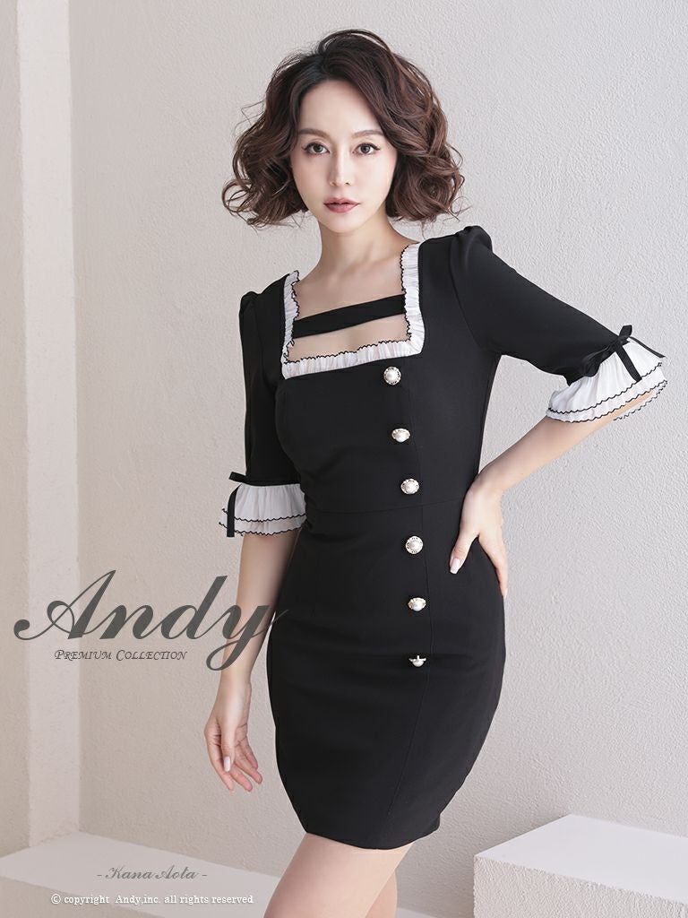 6. [Andy/アンディ] 高級バイカラーフリルリボンパールボタン袖ありタイトミニドレス