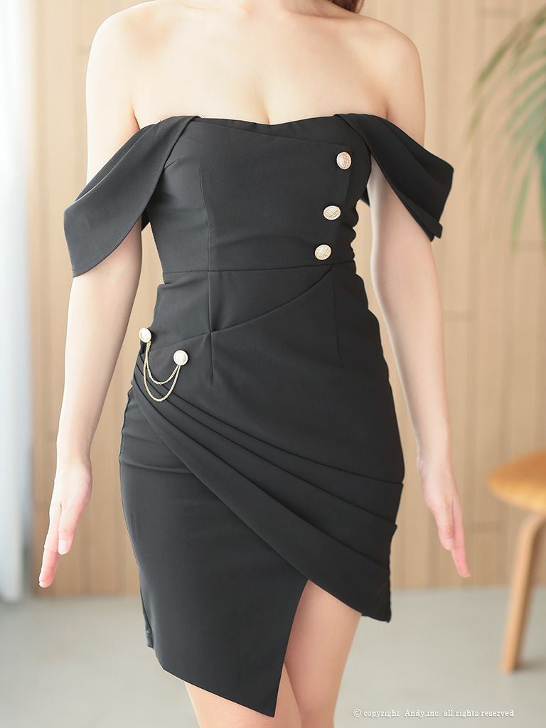 ゴールドボタン×チェーンで高魅え☆ [Andy/アンディ] 高級2wayオフショルダーゴールドボタンチェーンアシンメトリーシンプルタイトミニドレス