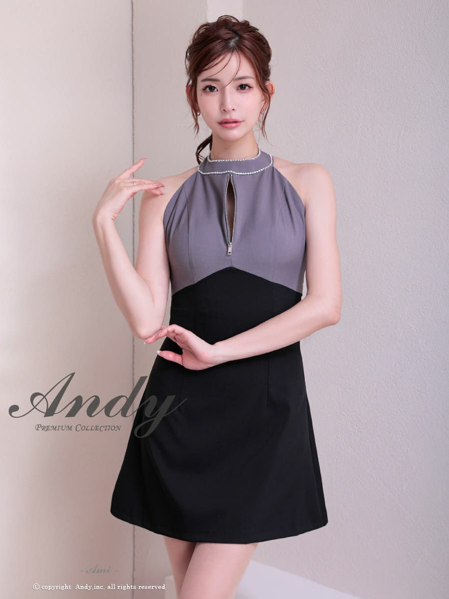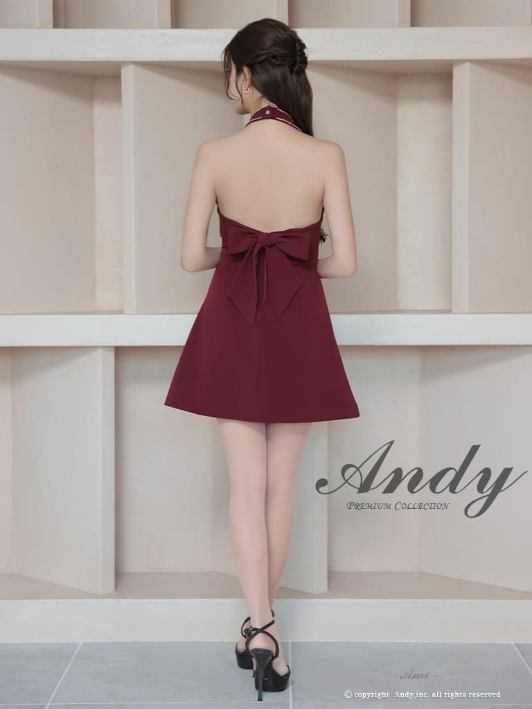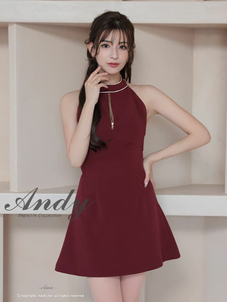 キャバドレス Andy アンディ 高級 ホルターネック ジップデザイン ビジュー バックカット リボン フレア ミニドレス