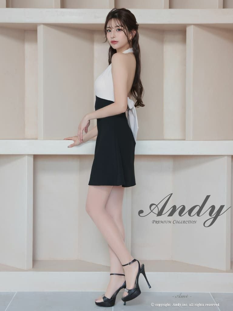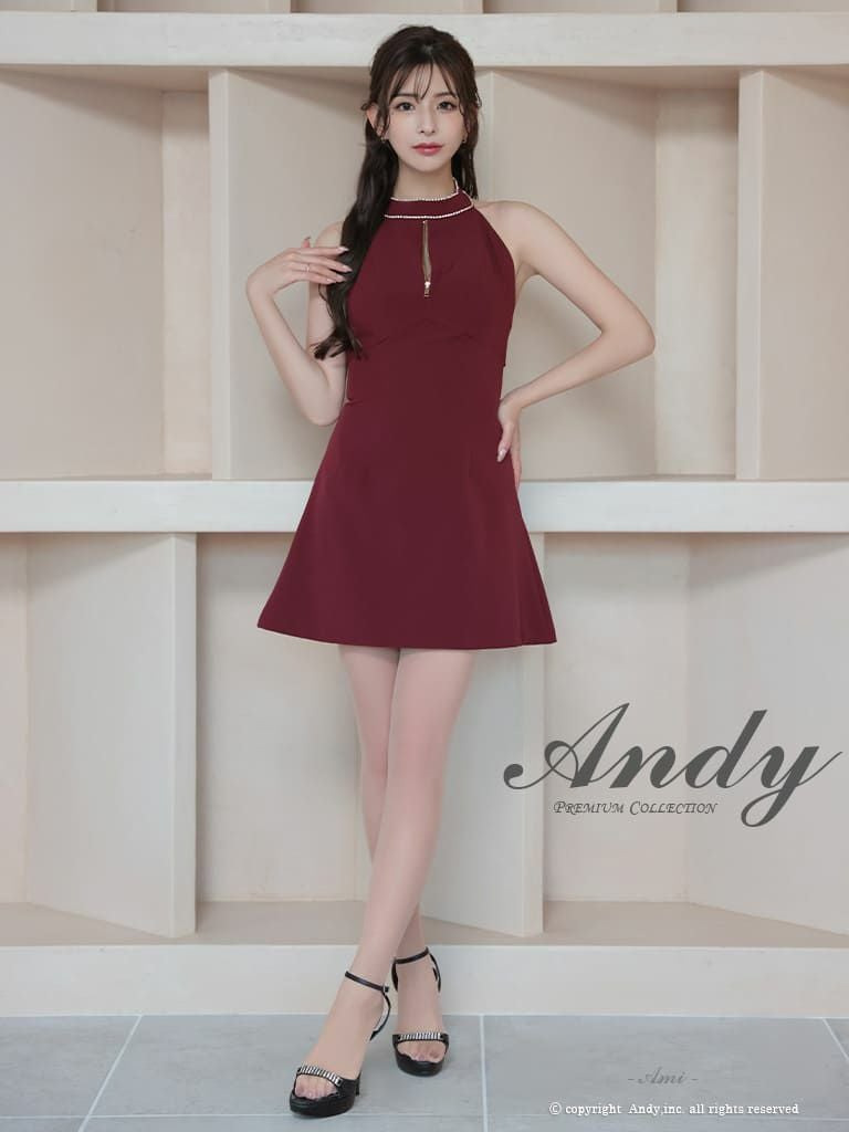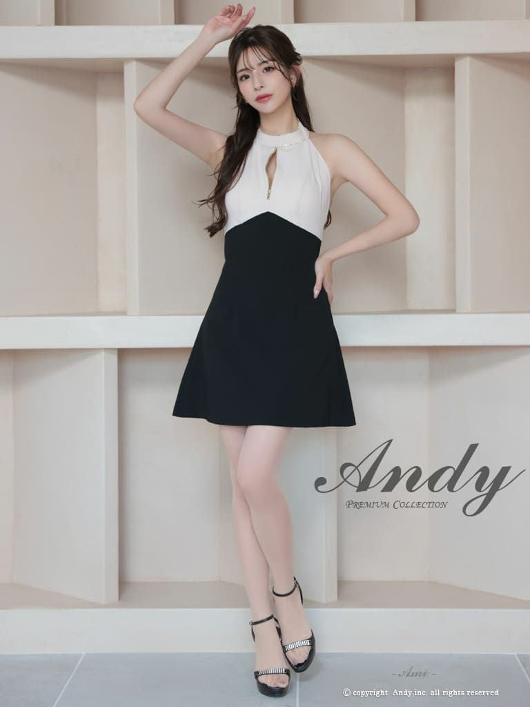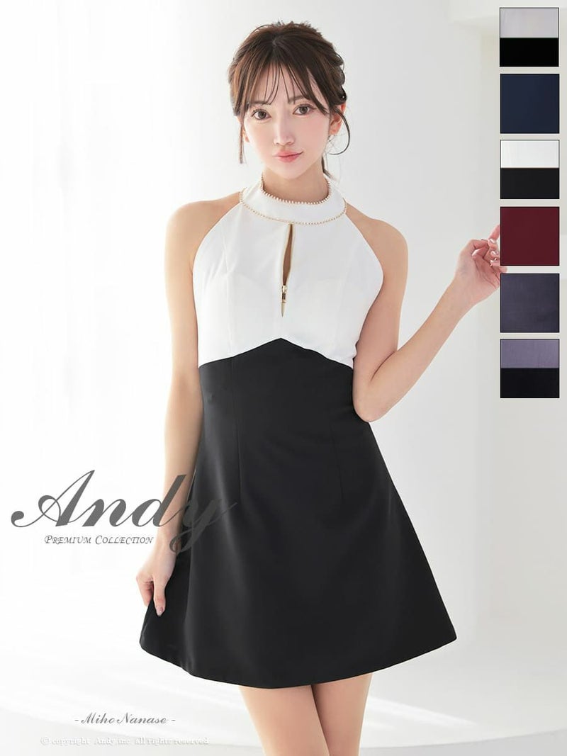 キャバドレス Andy アンディ 高級 ホルターネック ジップデザイン ビジュー バックカット リボン フレア ミニドレス