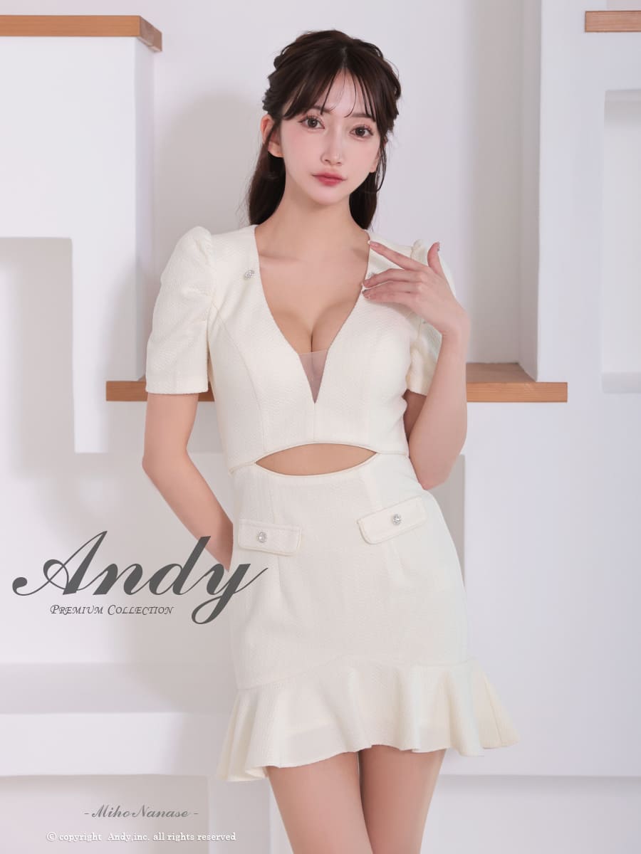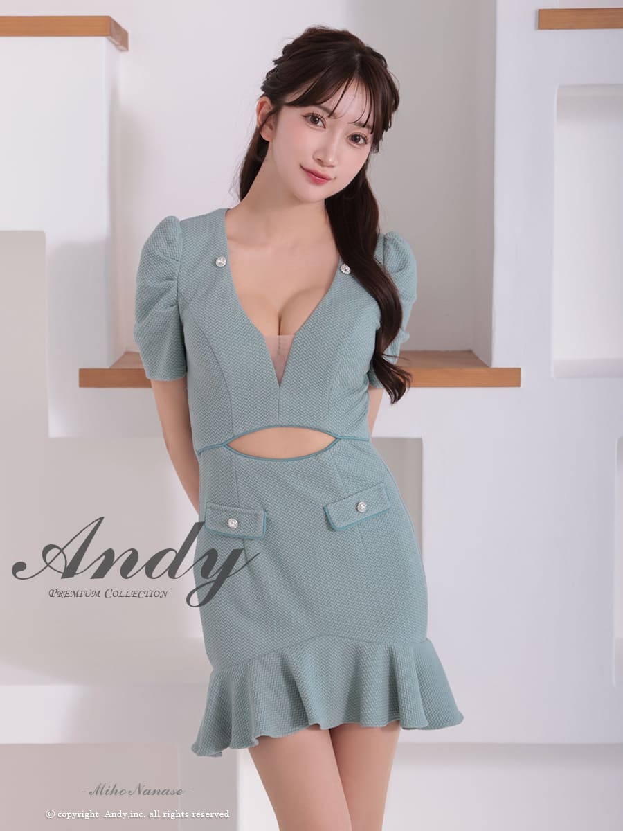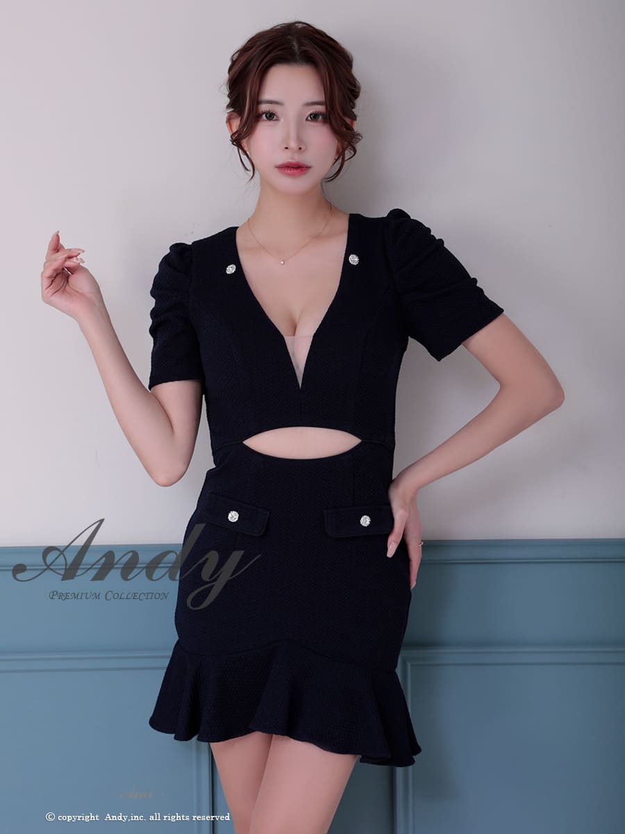 キャバドレス Andy アンディ 高級 半袖 ウエストカット バストシースルー チェーン 裾フリル ボタン タイトミニドレス