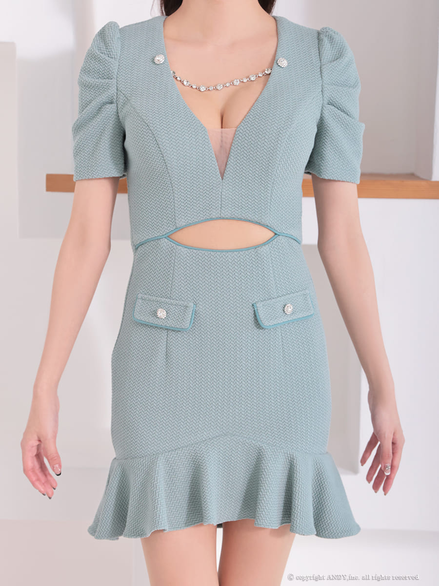 4. [Andy/アンディ] 高級 半袖 ウエストカット バストシースルー チェーン 裾フリル ボタン タイトミニドレス