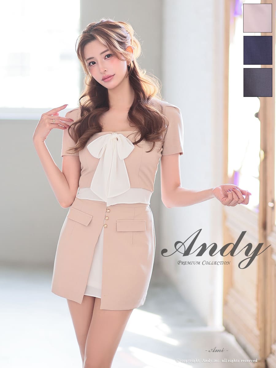 3. [Andy/アンディ] 高級 半袖 スクエアネック リボン スリット セットアップ ゴールドボタン タイトミニドレス