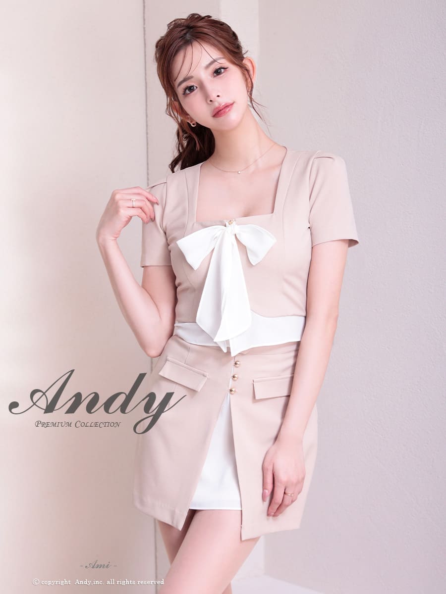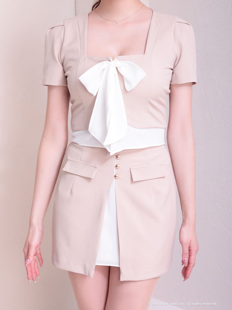 4. [Andy/アンディ] 高級 半袖 スクエアネック リボン スリット セットアップ ゴールドボタン タイトミニドレス
