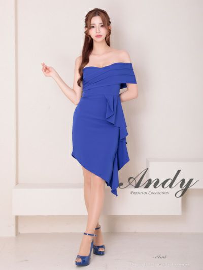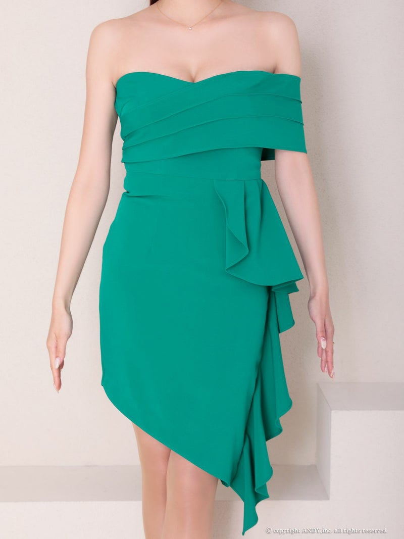 キャバドレス Andy アンディ 高級 オフショルダー ワンカラー フリルデザイン アシンメトリー タイト膝丈ドレス