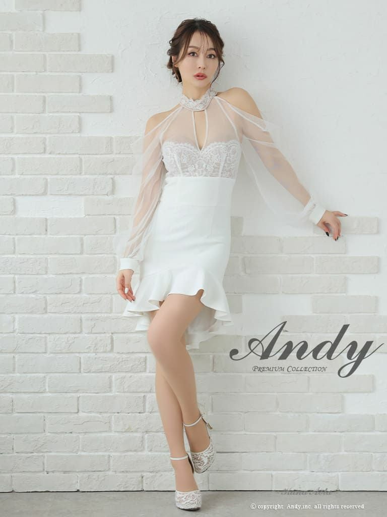 キャバドレス Andy アンディ 高級 長袖 タイトミニドレス レース シアー 裾フリル 肩あき バックオープン