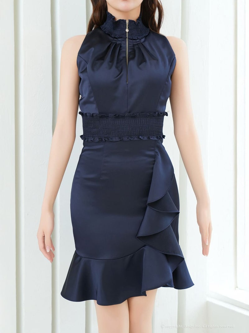 キャバドレス Andy アンディ 高級 ノースリーブ タイトミニドレス ハイネック ジップ バストカット ウエストマーク フリル ワンカラー