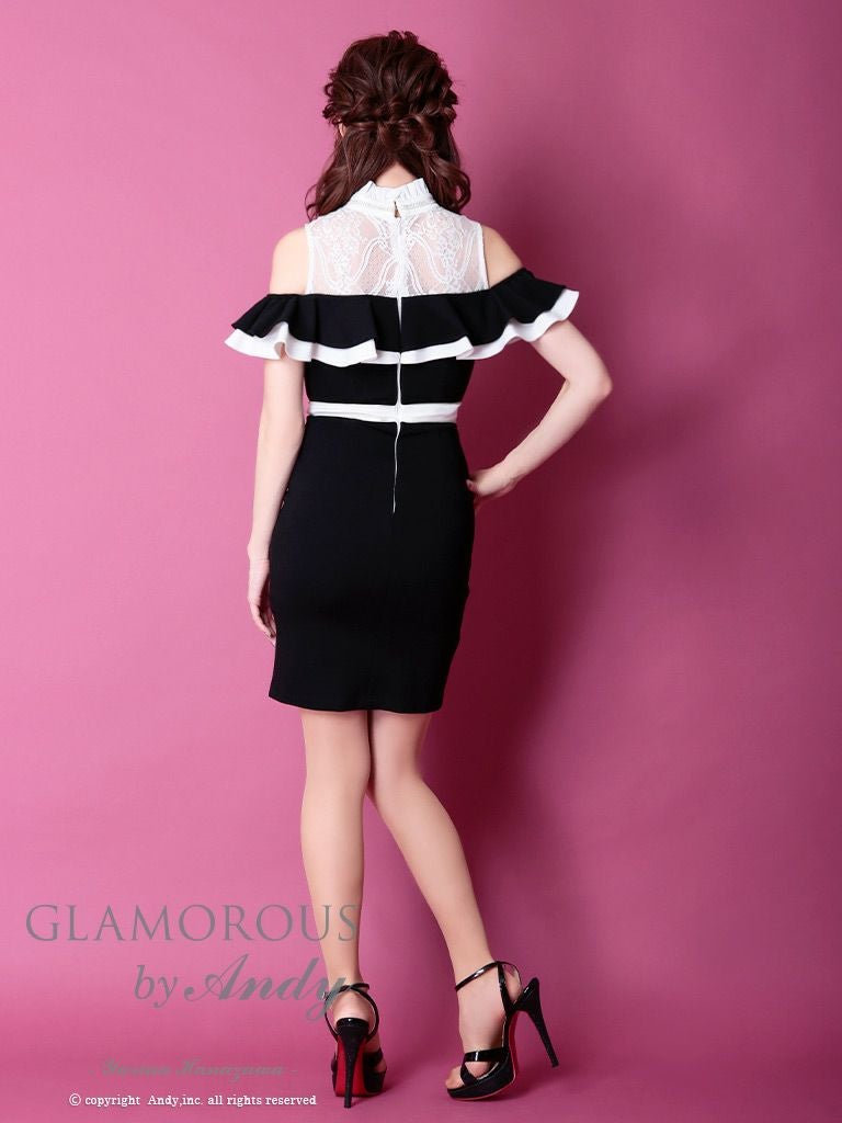 キャバドレス AndyGLAMOROUS アンディグラマラス 高級肩あきジップフリルビジューレーススリットタイトミニドレス