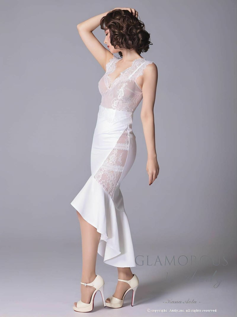 5. [AndyGLAMOROUS/アンディグラマラス] 高級 スカラップレース マーメイドフリル サイド切替 ノースリーブ タイト膝丈ドレス