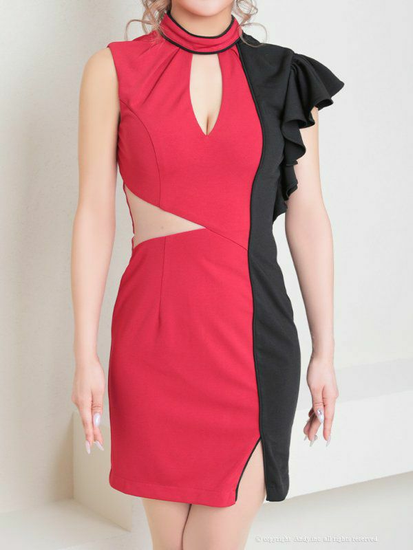 4. [AndyGLAMOROUS/アンディグラマラス] 高級 バイカラー バストカット ウエストヌーディーシアー アシメフリル ノースリーブ 谷間魅せ タイトミニドレス