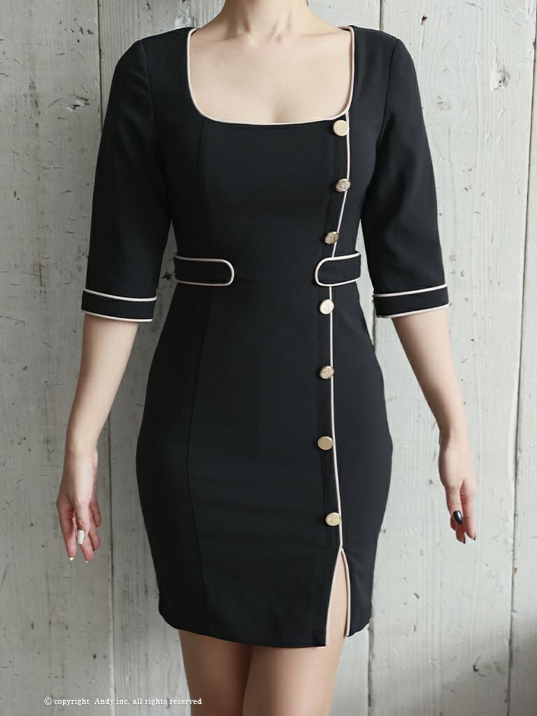6. [AndyGLAMOROUS/アンディグラマラス] 高級袖ありゴールドボタンスクエアネックタイトミニドレス