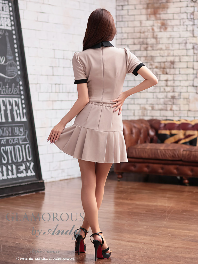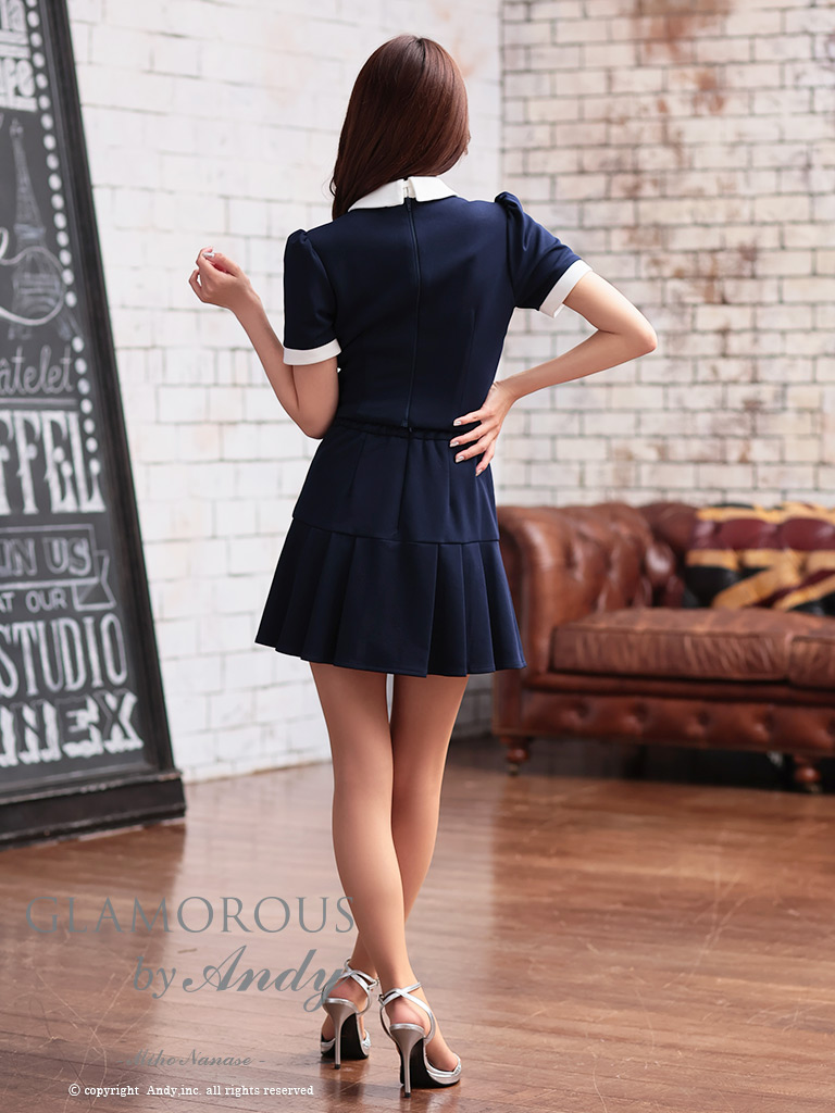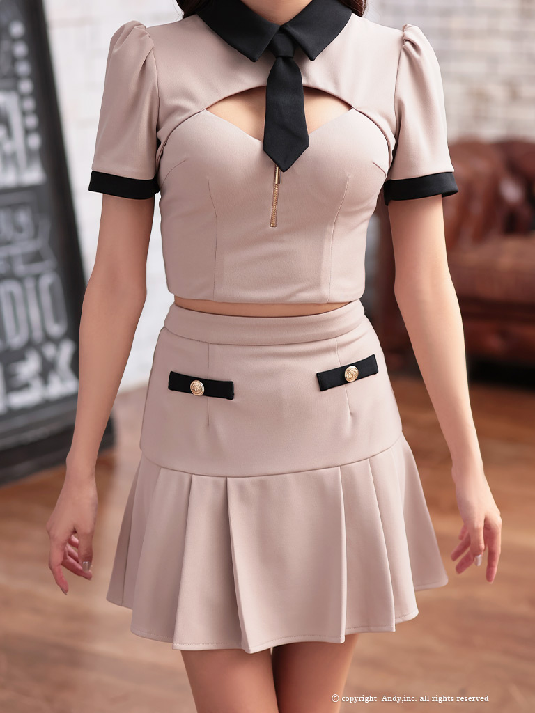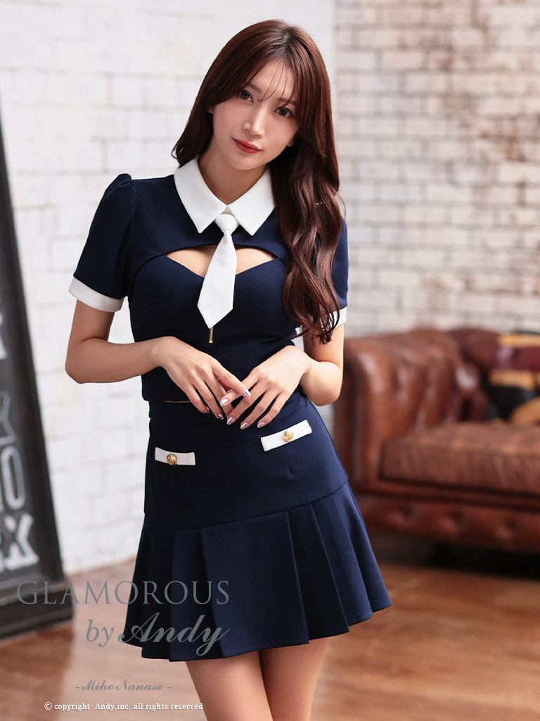 ネクタイの着脱でふた通り着こなせちゃう☆ [AndyGLAMOROUS/アンディグラマラス] 高級 半袖 襟付き ゴールドボタン バストカット セットアップ 谷間魅せ フレアミニドレス
