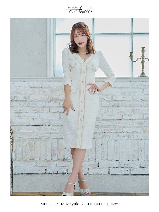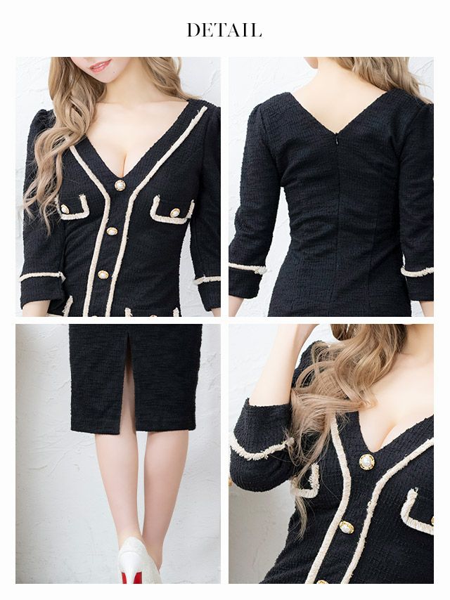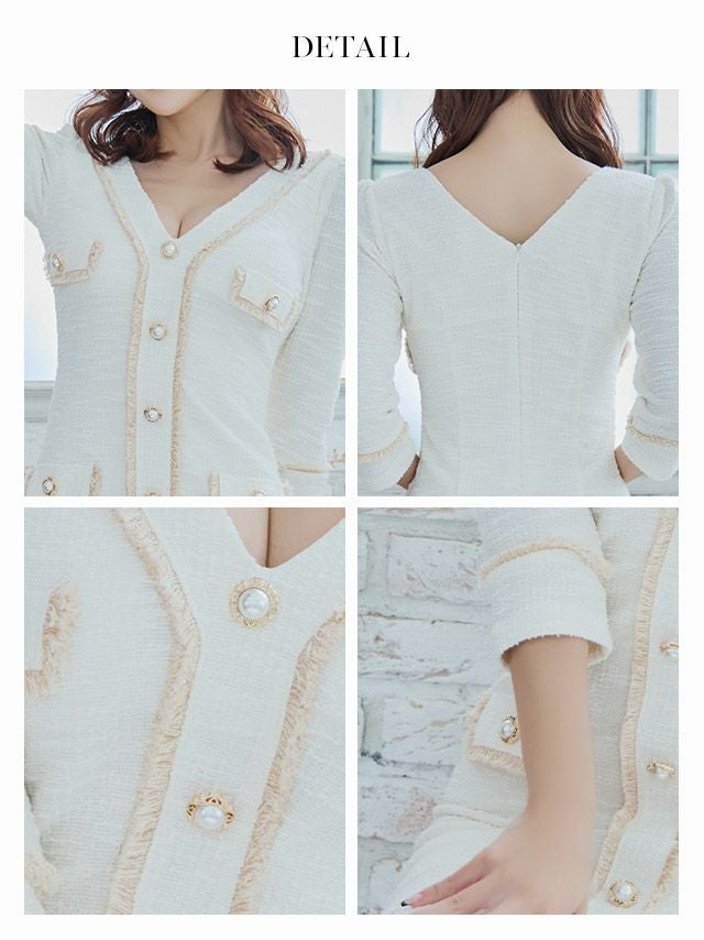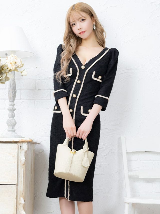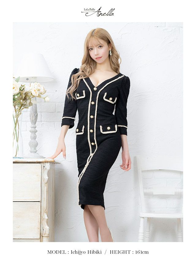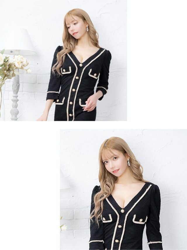 他の画像を見る 大胆な深めのVネック☆ [韓国ドレス] タイト膝丈ドレス 袖あり 七分袖 ツイード ゴールドボタン (Sサイズ~Lサイズ) (一条響着用) [Anella] ¥ 16,500 税込 詳細を見る お気に入りに追加