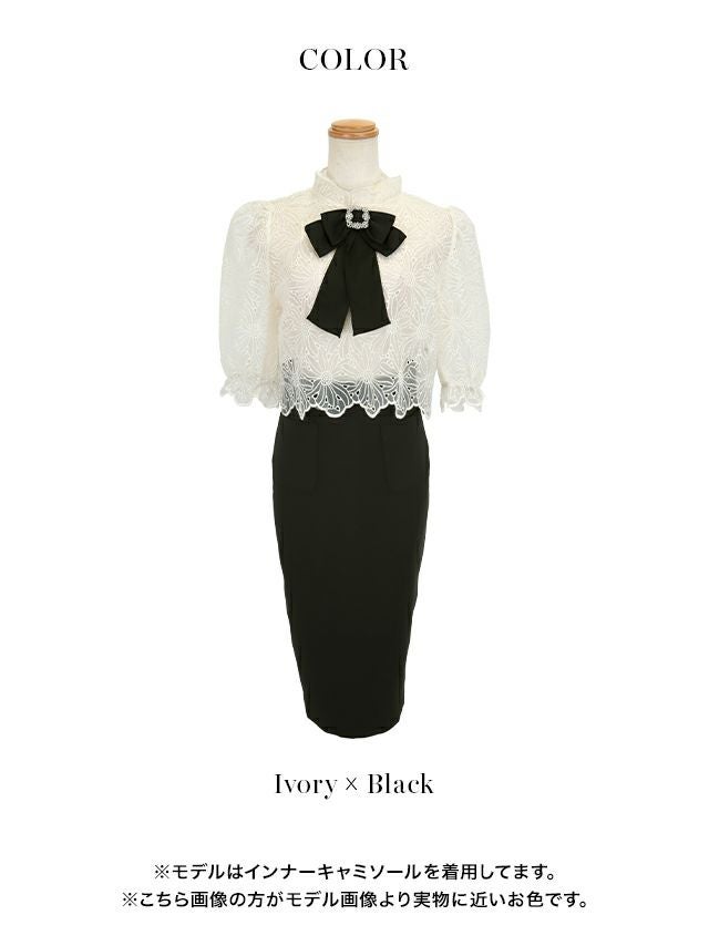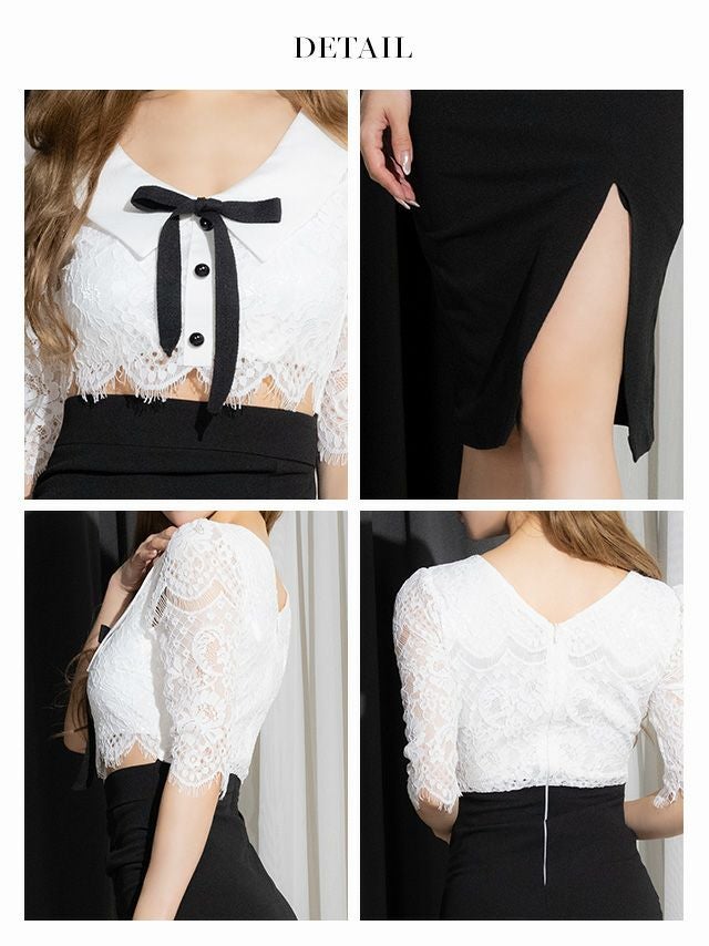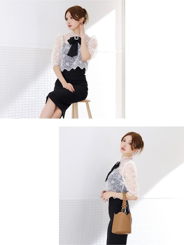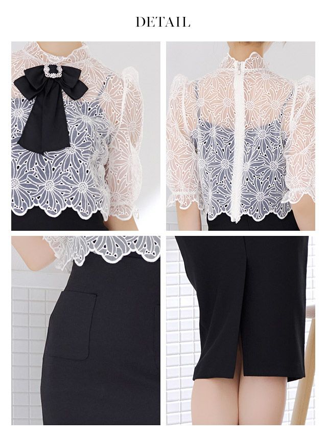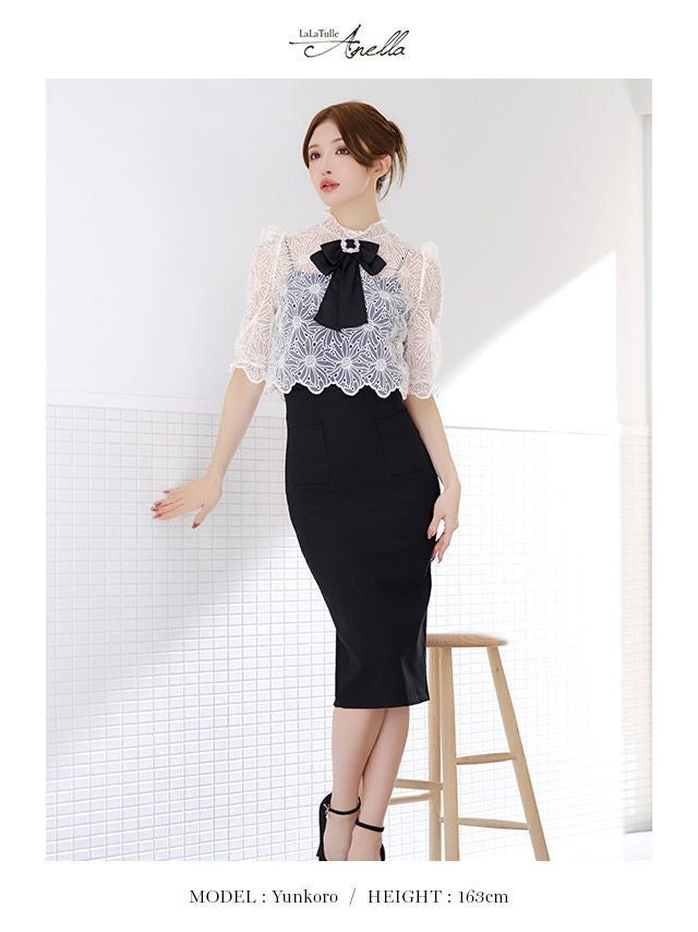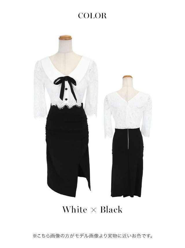 他の画像を見る 2/17再入荷★大人っぽさと程よい甘さを両立♪ [韓国ドレス] タイト膝丈ドレス 袖あり 五分袖 レース ウエストカット 襟付き ネックリボン スリット モノトーン 大人 (Sサイズ~Lサイズ) (ゆんころ着用) [Anella] ¥ 15,400 税込 詳細を見る お気に入りに追加