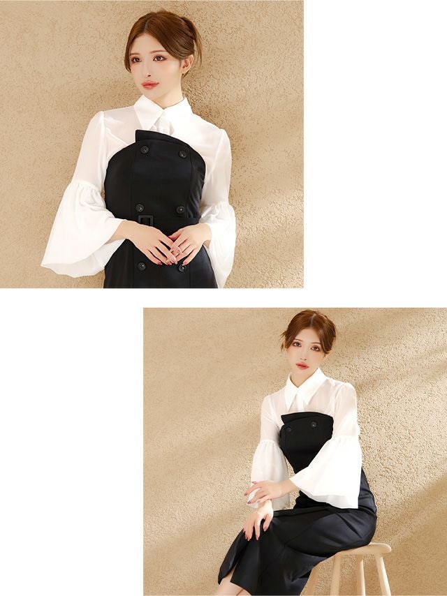 他の画像を見る サロペット風で可愛い☆ [SUPER SALE] 韓国ドレス タイト膝丈ドレス 長袖 袖あり ネックリボン 襟付き 胸元カバー バイカラー サロペット風 (Sサイズ~Lサイズ) (一条響着用) [Anella] ¥ 29,700 ¥ 19,800 税込 詳細を見る お気に入りに追加