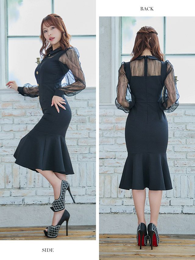 4. [SALE] [韓国ドレス] 膝丈ドレス 長袖 袖あり マーメイド 襟付き シースルー 線デザイン (Sサイズ~Lサイズ) (伊藤舞雪着用) [Anella]