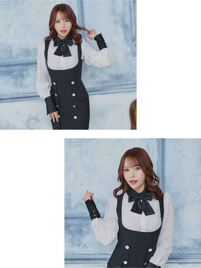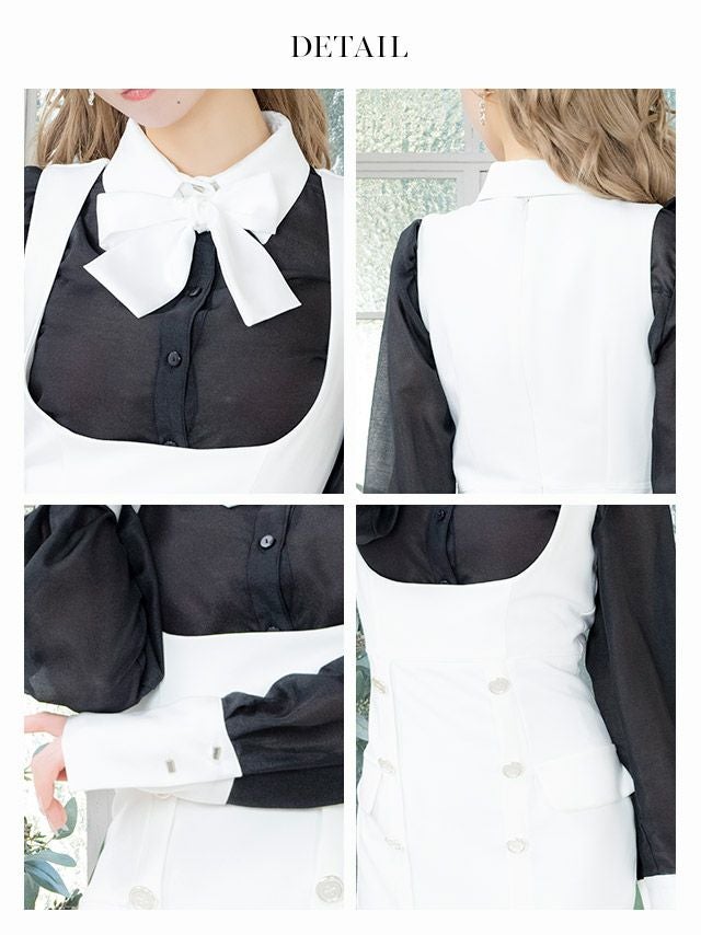 キャバドレス Anella アネラ バイカラー サロペット風 襟デザイン ネックリボン 長袖 タイト 膝丈 韓国ドレス