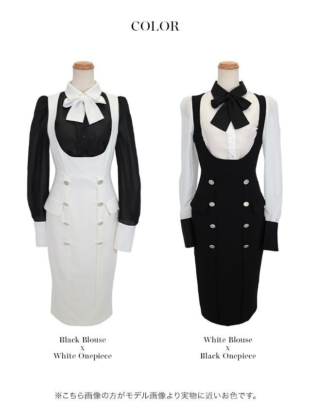 3. [SALE] 韓国ドレス タイト膝丈ドレス 長袖 袖あり ネックリボン 襟付き 胸元カバー バイカラー サロペット風 (Sサイズ~Lサイズ) (一条響着用) [Anella]
