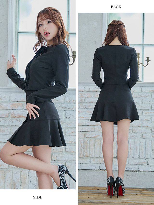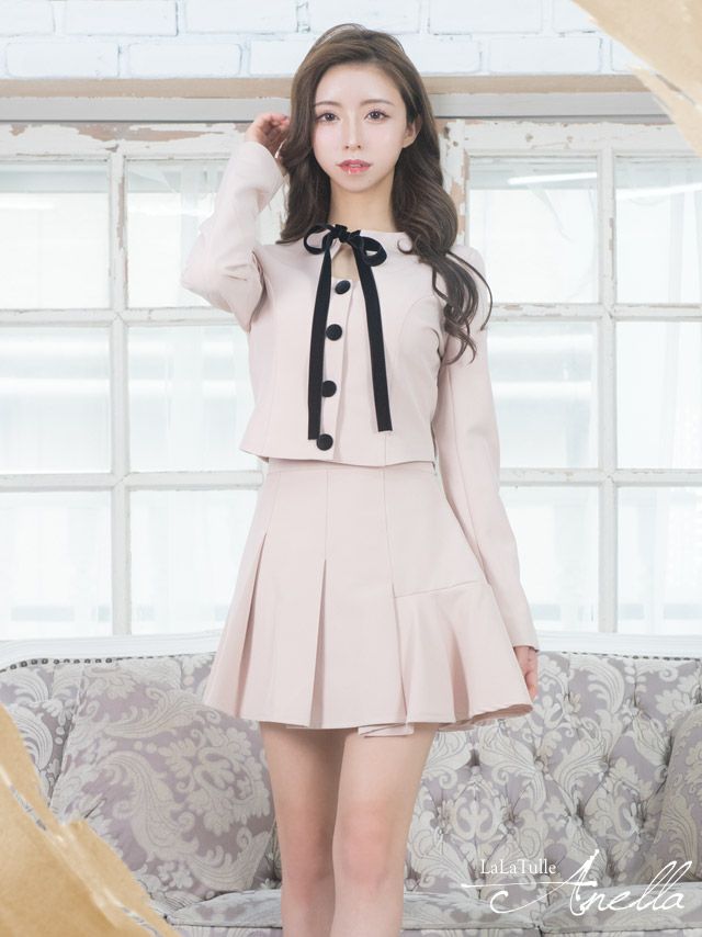 Anella アネラ 長袖ベロアネックリボンジャケット×ボックスタックスカートセットアップフレアミニ韓国ドレス (Sサイズ~Lサイズ) (一条響 キャバ韓国ドレス着用)
