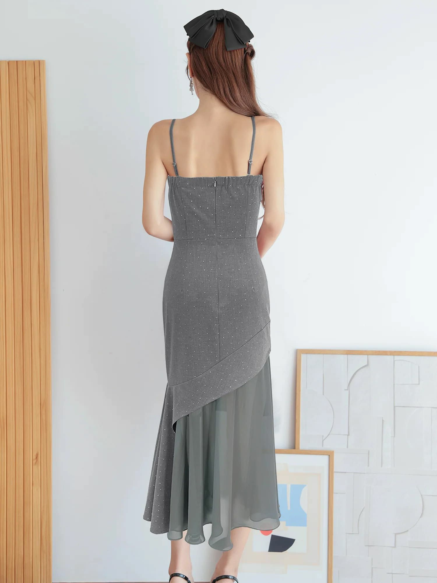3. [Angel-R/エンジェルアール] 高級 ブランド タイトロングドレス キャミソール ラメ アシンメトリー シフォン (もも着用)