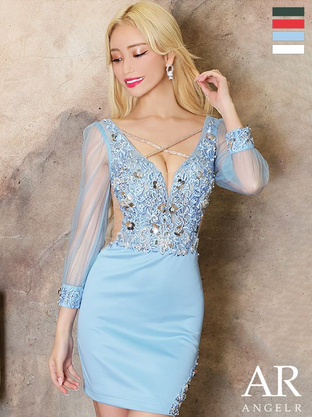 キャバドレス ミニドレス Angel-R エンジェルアール 高級バストクロスビジュースパンコールフラワー刺繡シースルー長袖タイトミニドレス