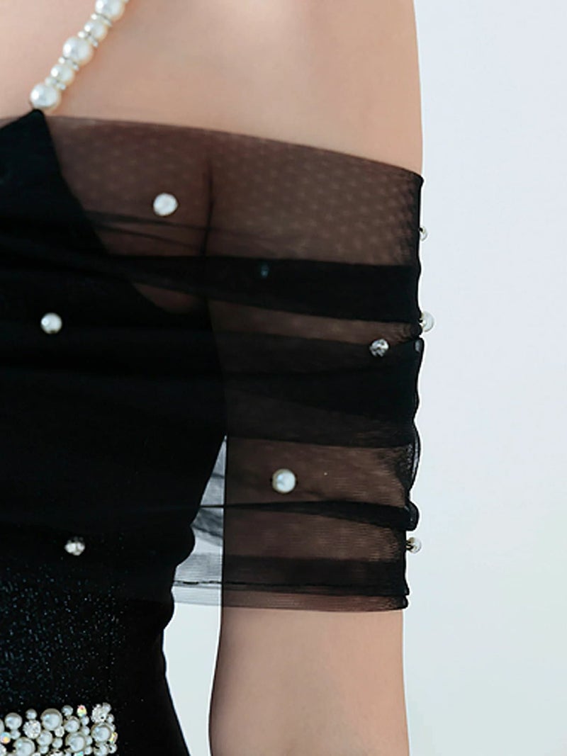 5. [Angel-R/エンジェルアール] 高級リボンモチーフ肩出し 二の腕カバーウエストパールラメタイトミニドレス