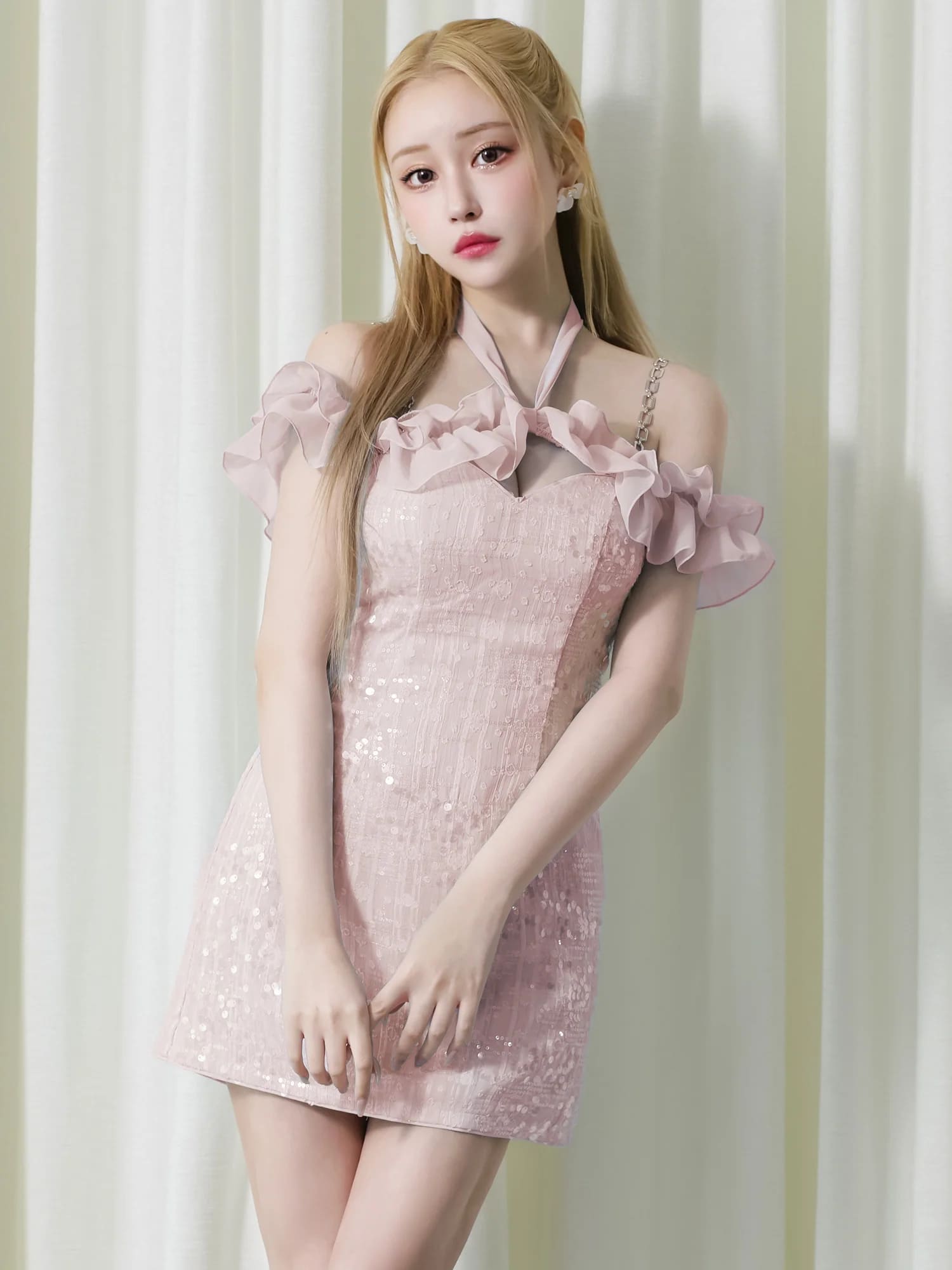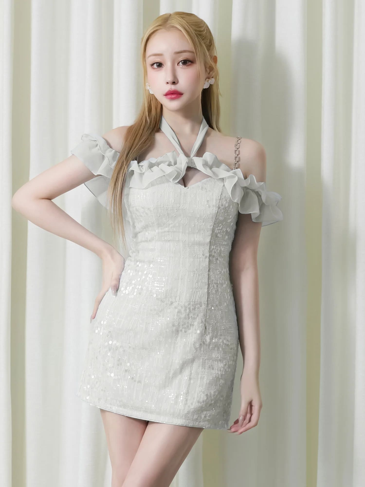 4. [Angel-R/エンジェルアール] 高級 2way オフショルダー 胸元フリル スパンコール フレアミニドレス