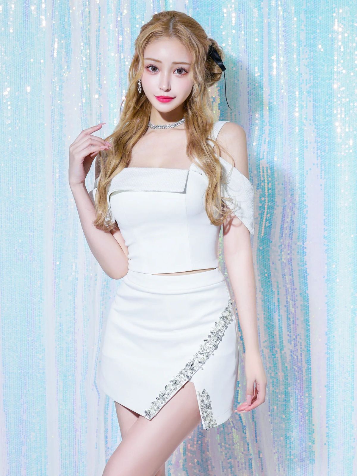 5. [Angel-R/エンジェルアール] 高級 アシンメトリー 肩出し 二の腕カバー ビジュー ラップ風 アシメスリット セットアップ タイトミニドレス