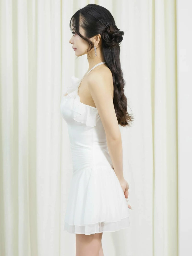 4. [Angel-R/エンジェルアール] 高級 立体フラワーモチーフ ホルターネック 胸元フリル バストカット ウエストタック 背中魅せ フレアミニドレス