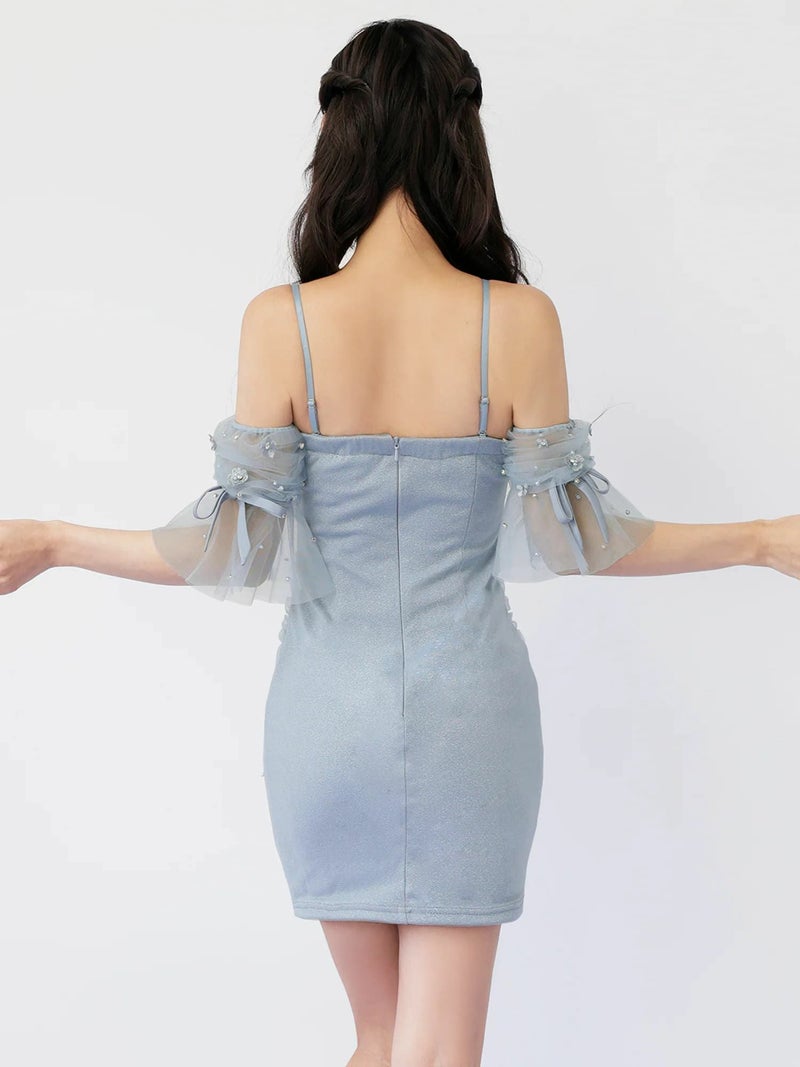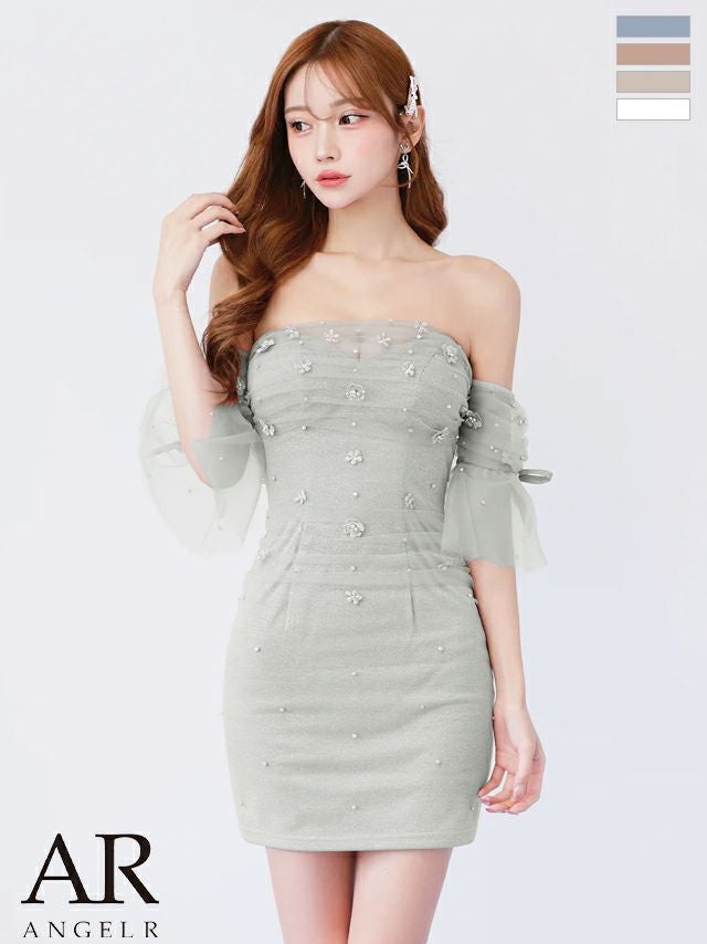 シアースリーブで可愛く二の腕カバー♡ [Angel-R/エンジェルアール] 高級 ブランド タイトミニドレス オフショルダー 肩出し 2way バストシースルー フラワー刺繍 パール