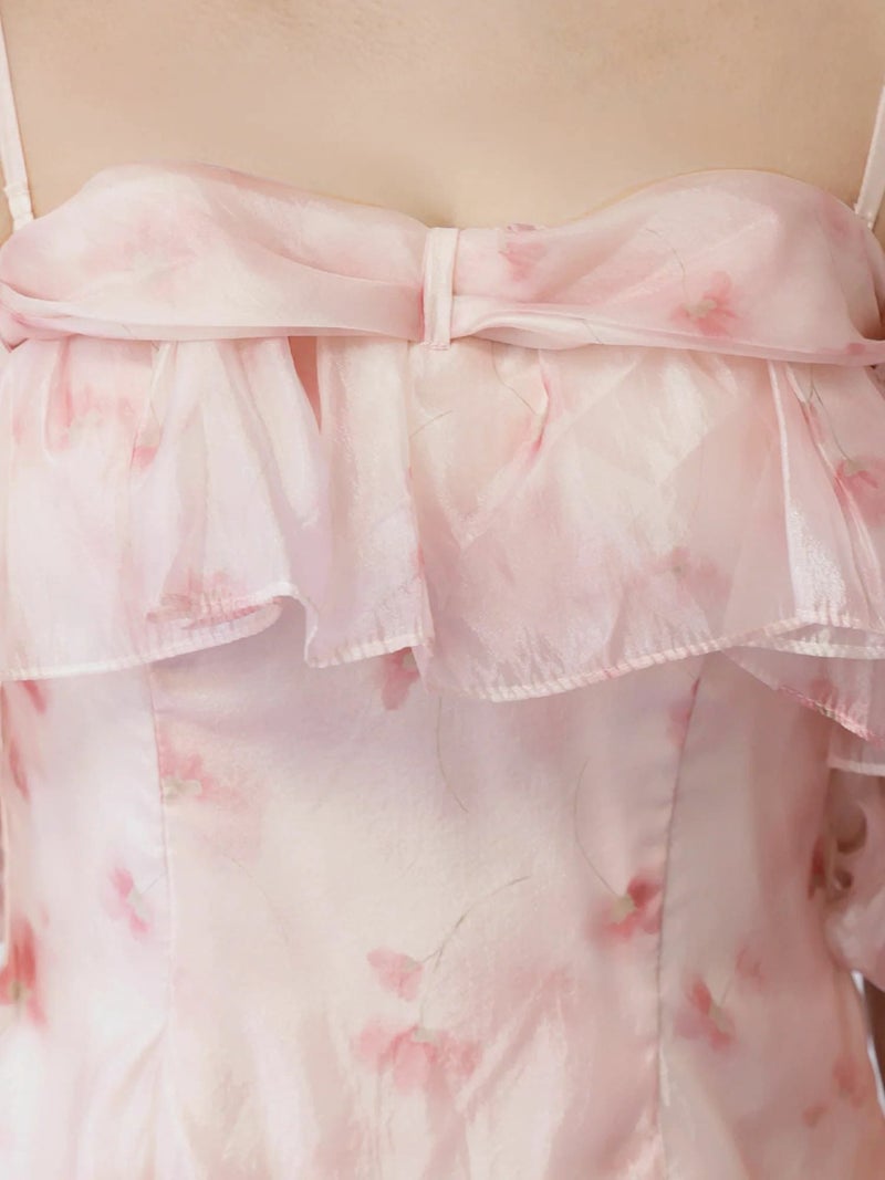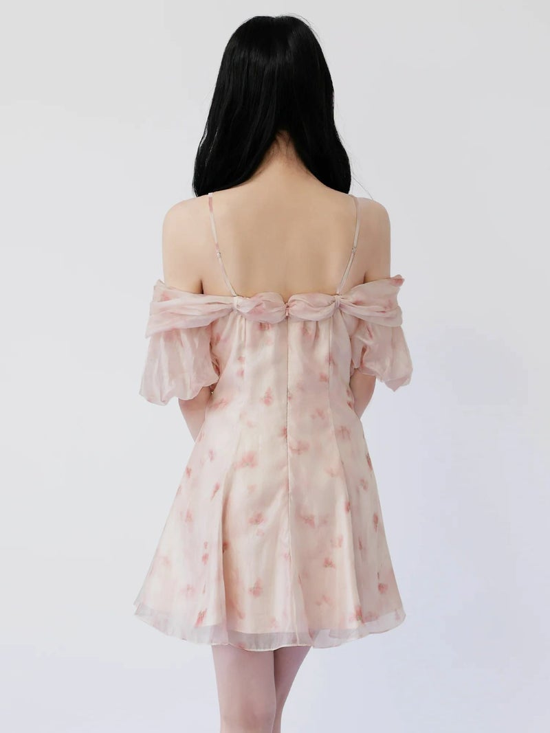 気分で着こなしを楽しめる2wayデザイン♡ [Angel-R/エンジェルアール] 高級 ブランド Aラインミニドレス オフショルダー 肩出し 2way フラワープリント シフォン 胸元フリル