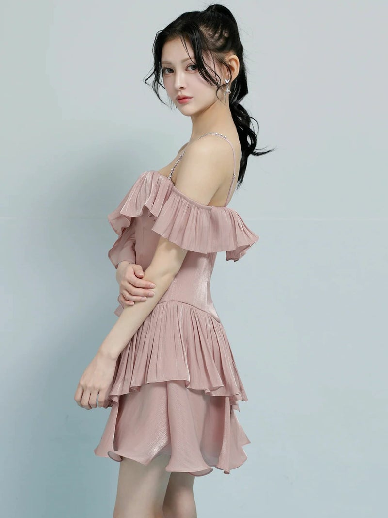 上品な華やかさで魅了する♡ 予約商品【4月中旬入荷予定】[Angel-R/エンジェルアール] 高級 ブランド Aラインミニドレス オフショルダー 2way バストカット ビジュー フリル シフォン