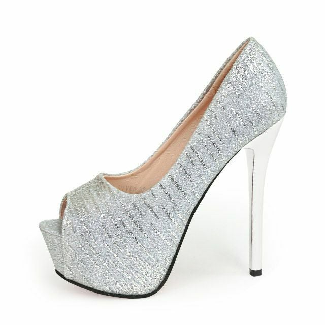 訳ありキャバサンダル [ワケありセール]ボーダーラメデザインオープントゥパンプス (シルバー) (14cmヒール)