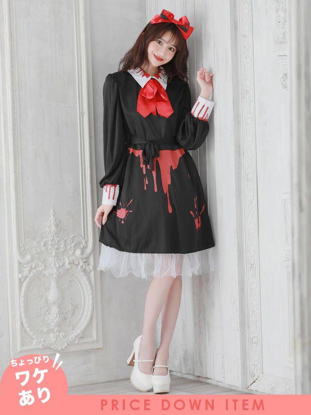 ちょっぴり訳ありの為、激安価格◎ [ワケありセール] アンティークホラードール体型カバー袖ありフレアスカートゾンビ [2点セット] (ワンピース/カチューシャ)