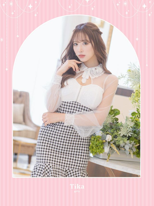 5. 長袖 袖あり シアー パフスリーブ 襟付き フラワーモチーフ ビジューリボン バストカット ジップ チェック柄 裾フリル 谷間魅せ タイトミニドレス (Sサイズ~XXXLサイズ) (重川茉弥/キャバドレス着用)