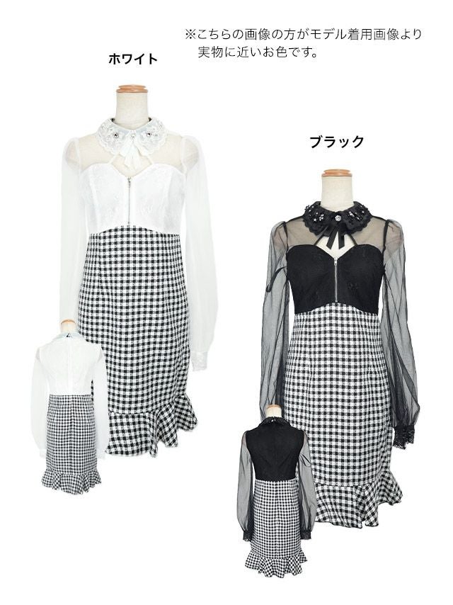長袖シアーパフスリーブ襟付きフラワーモチーフビジューリボンバストカットジップ切り替えチェック柄裾フリルタイトミニドレスのカラーバリエーション