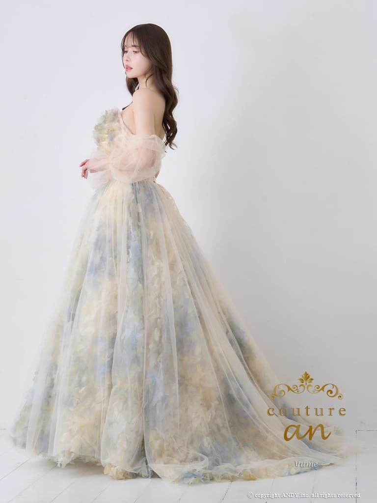 5. [couture an/クチュールアン] 高級 バースデー ベアトップ 長袖 チュール袖 背中魅せ Aラインロングドレス
